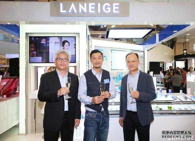 左-右,爱茉莉太平洋中国及台湾地区总裁高祥钦先生,著名演员余文乐先生,成都王府井百货总经理胡勇先生为兰芝全新专柜形象共同举杯祝贺